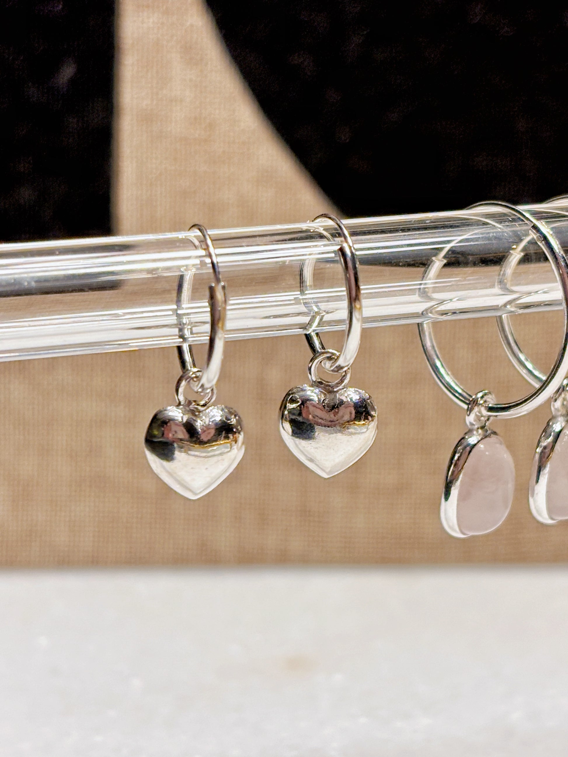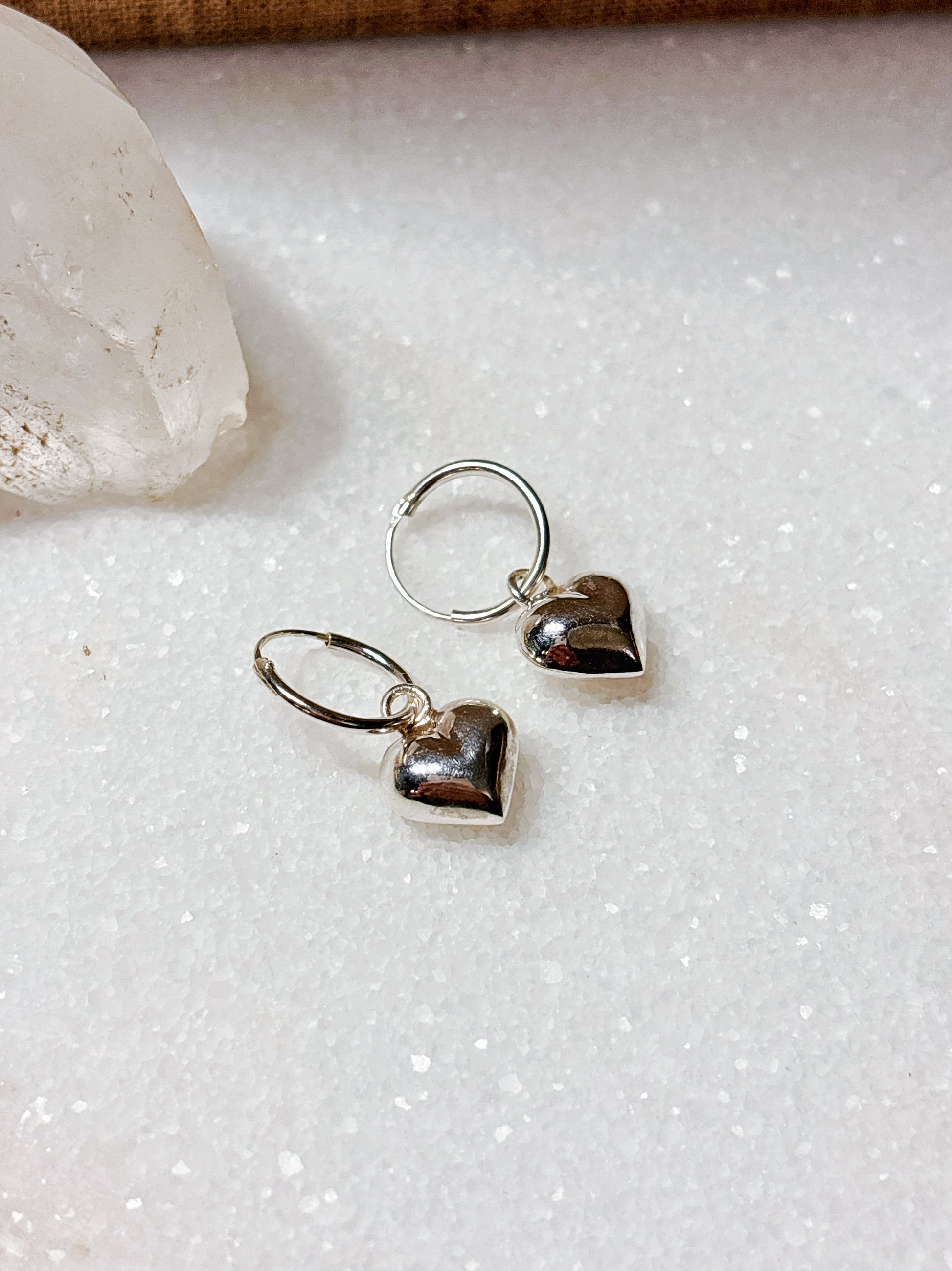 Aros tipo argolla con diseño de corazón en estilo chunky, elaborados en plata ley 925. Una pieza llamativa y moderna que mezcla ternura con personalidad.