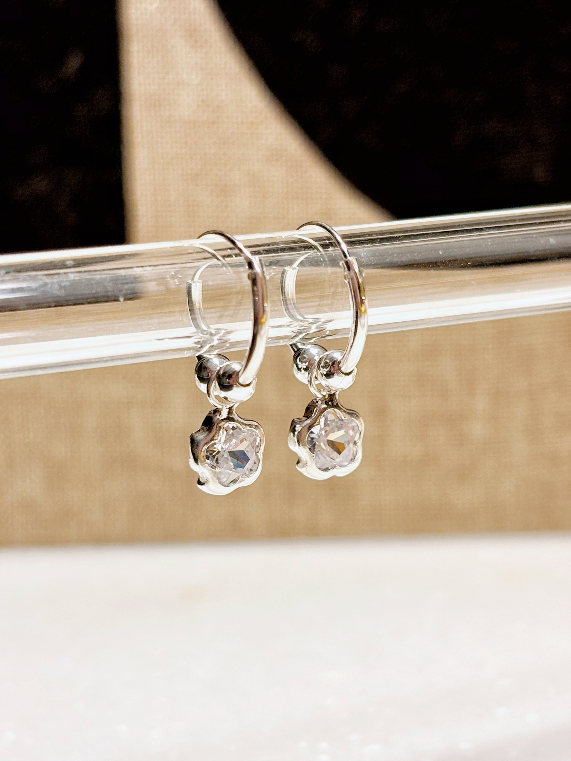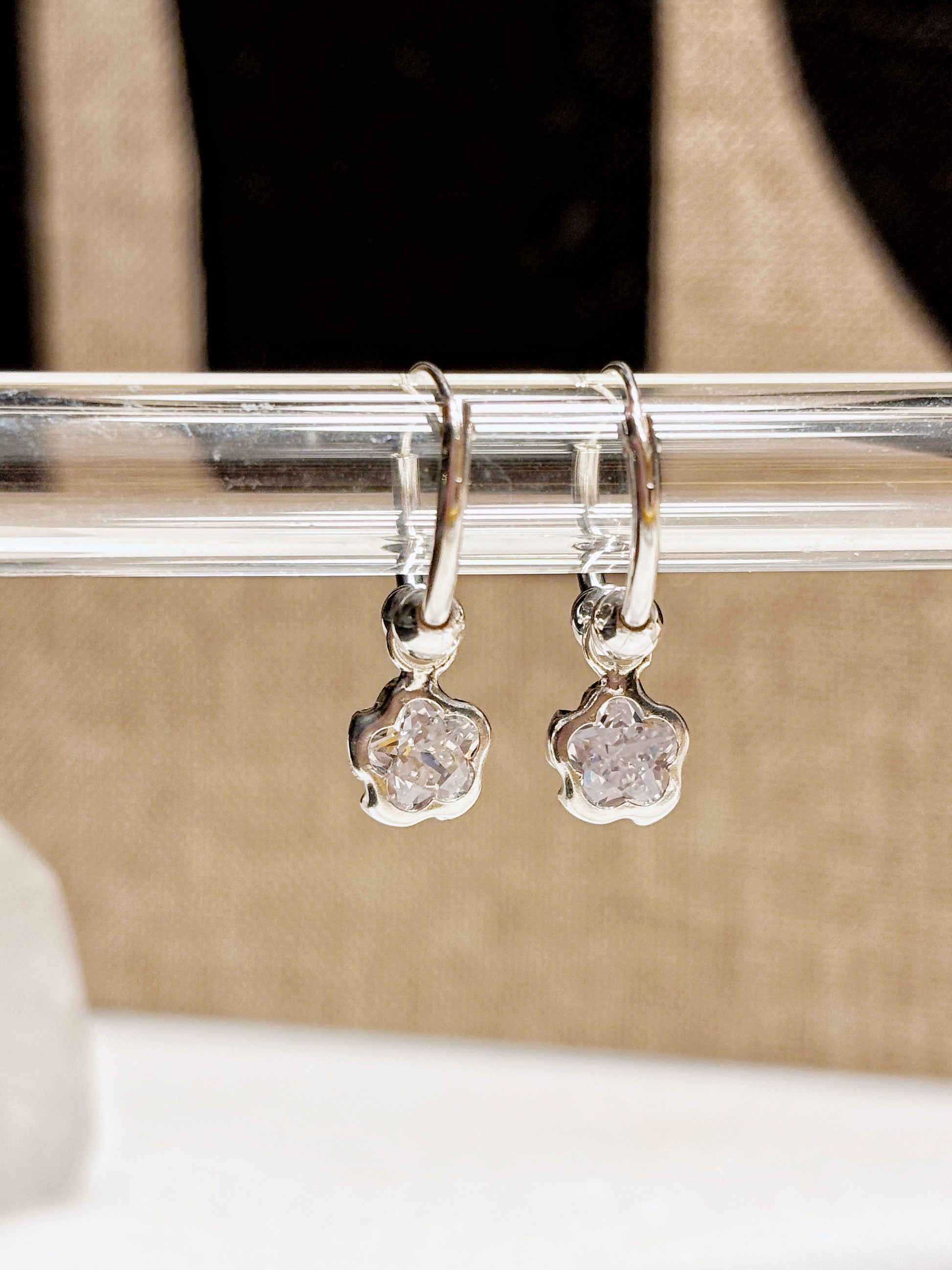 Aros en plata ley 925 con diseño de flor y circón son el equilibrio perfecto entre delicadeza y elegancia. Un accesorio sutil, lleno de luz y detalle.