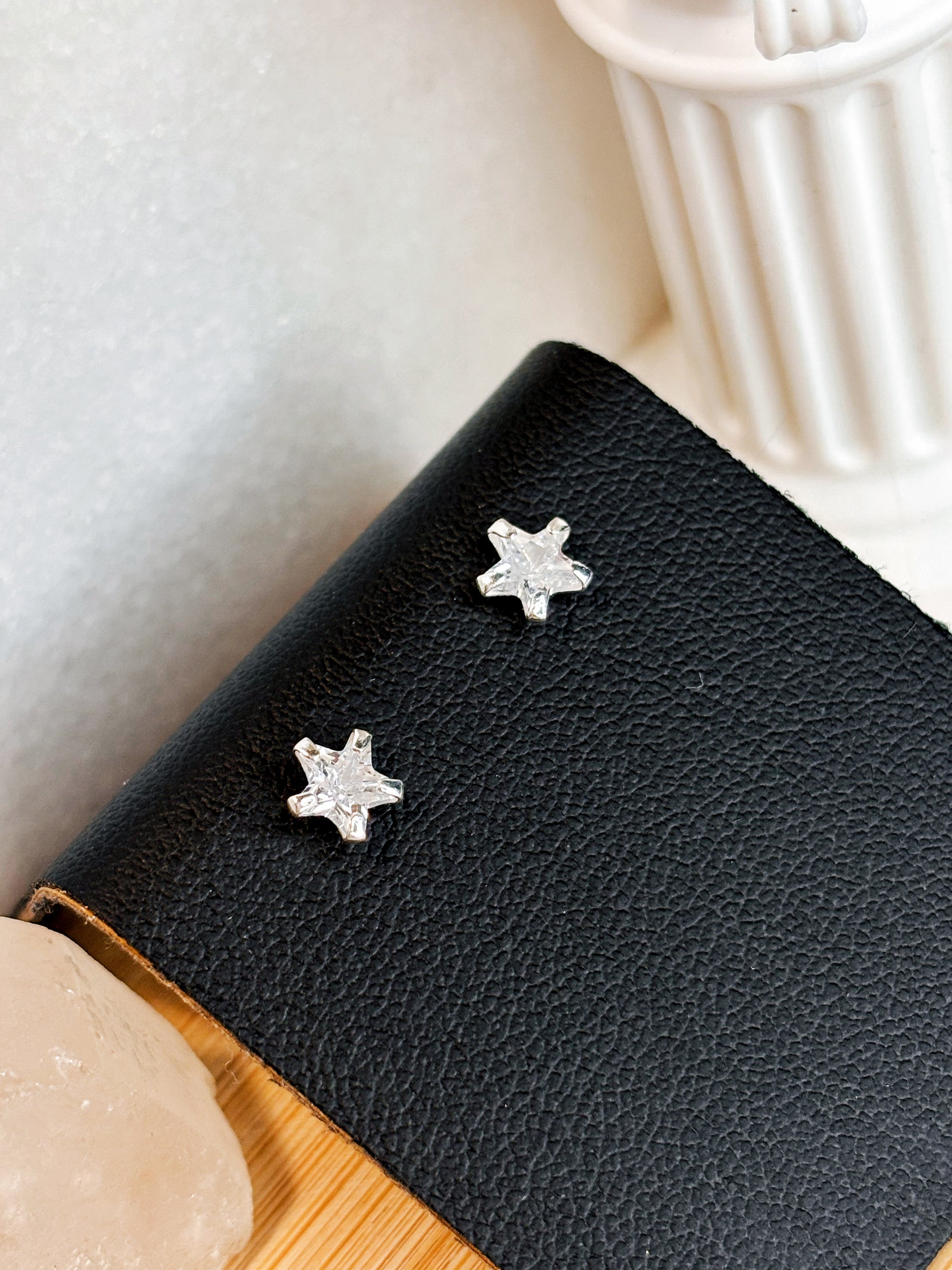 Pequeños y brillantes, estos aros combinan la elegancia de la plata de ley con el destello del circón en forma de estrella, perfectos para un look sutil y elegante.