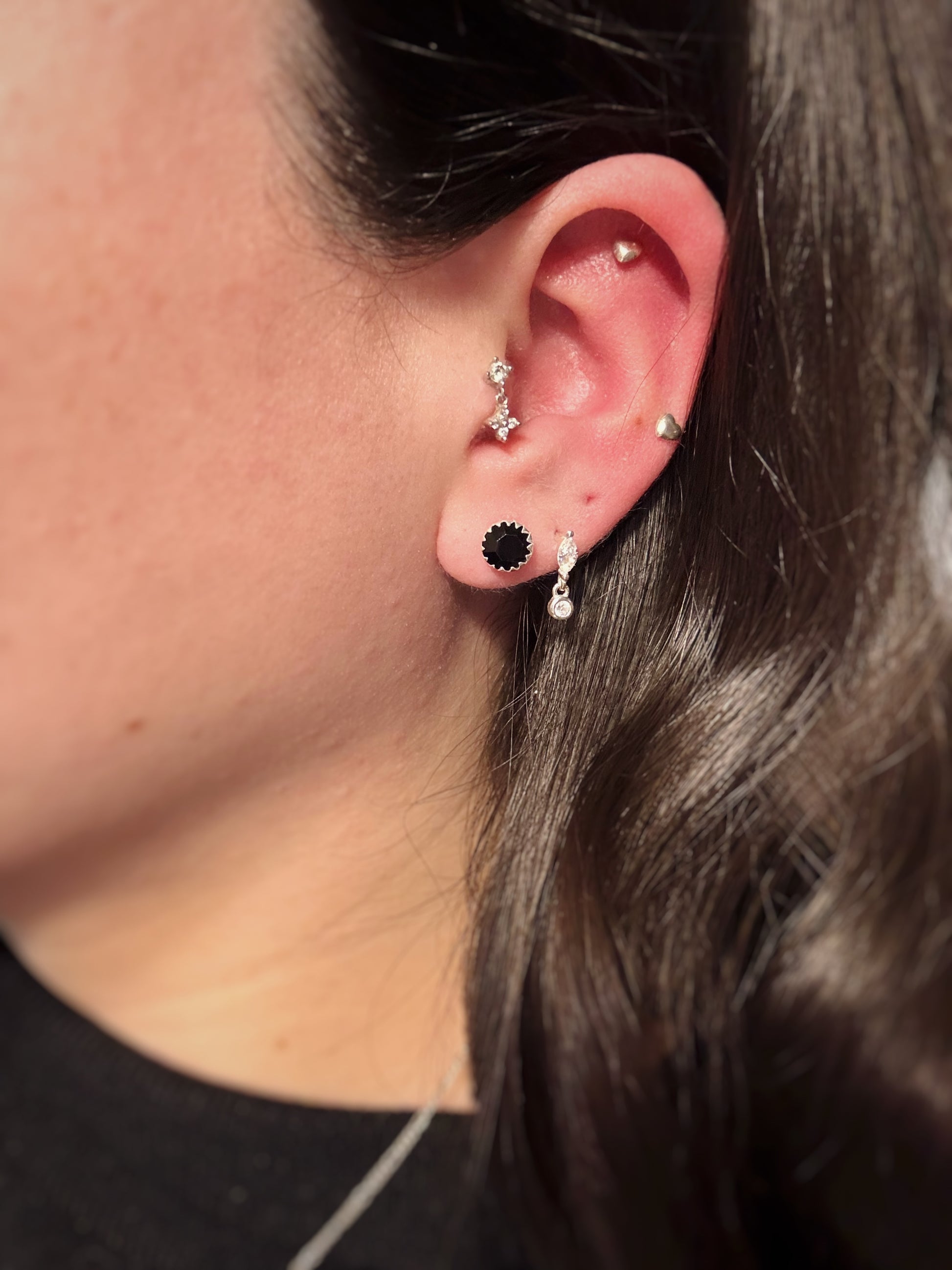 Aros en plata ley 925 con circón Swarovski negro. Elegancia atemporal con un toque de sofisticación y contraste, ideales para destacar en cualquier ocasión.