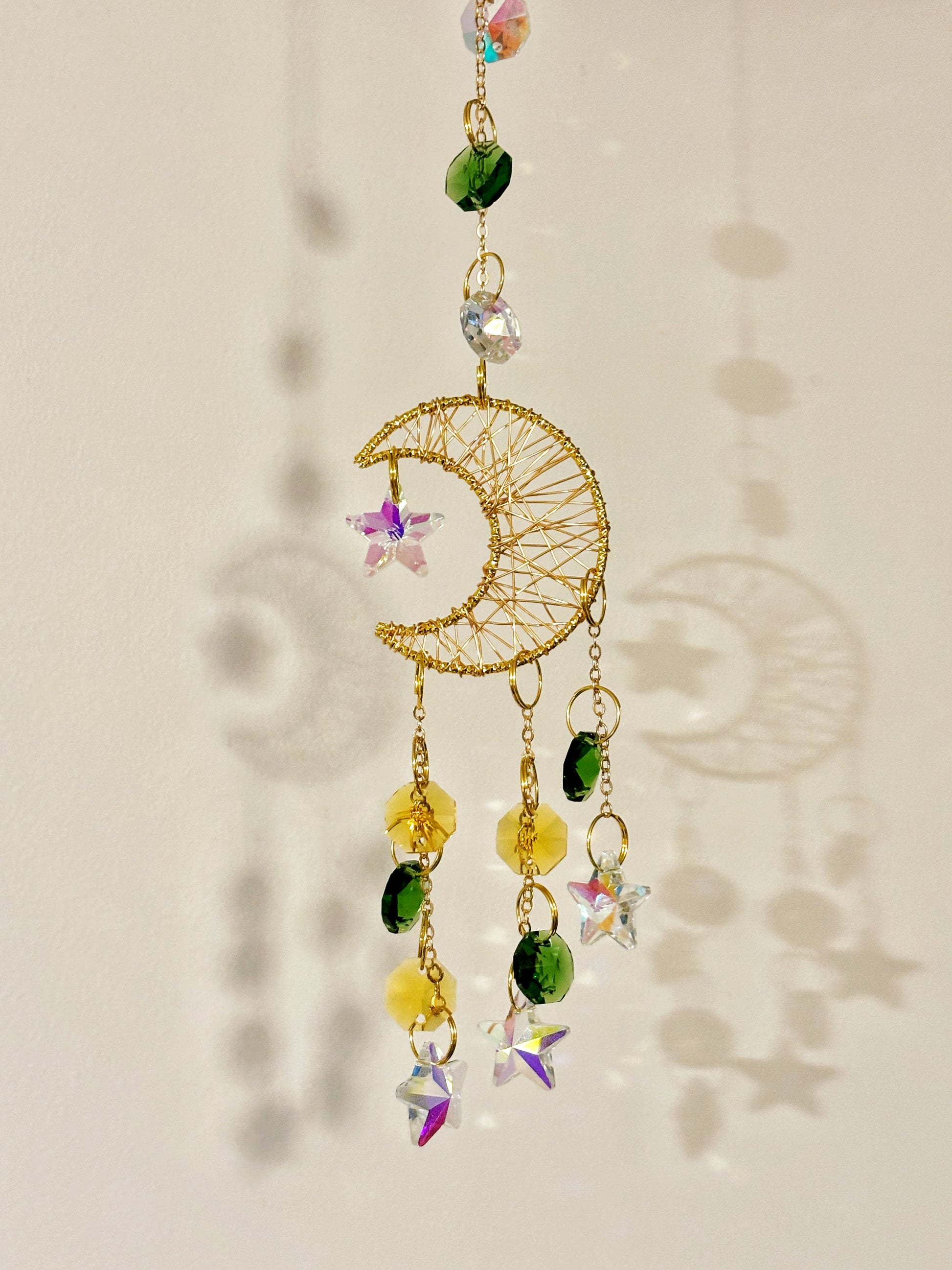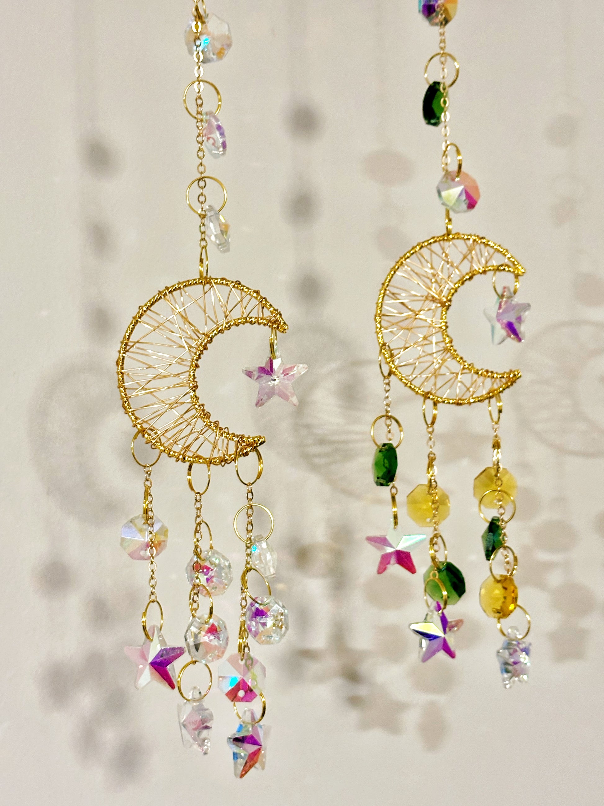 Transforma tu espacio con una pieza única que combina la delicadeza de los prismas y piedras para crear un ambiente mágico y armonioso. Más que un objeto decorativo, este colgante actúa como un captador de luz natural, proyectando suaves destellos multicolores sobre paredes y techos, llenando tu hogar de brillo y energía positiva.