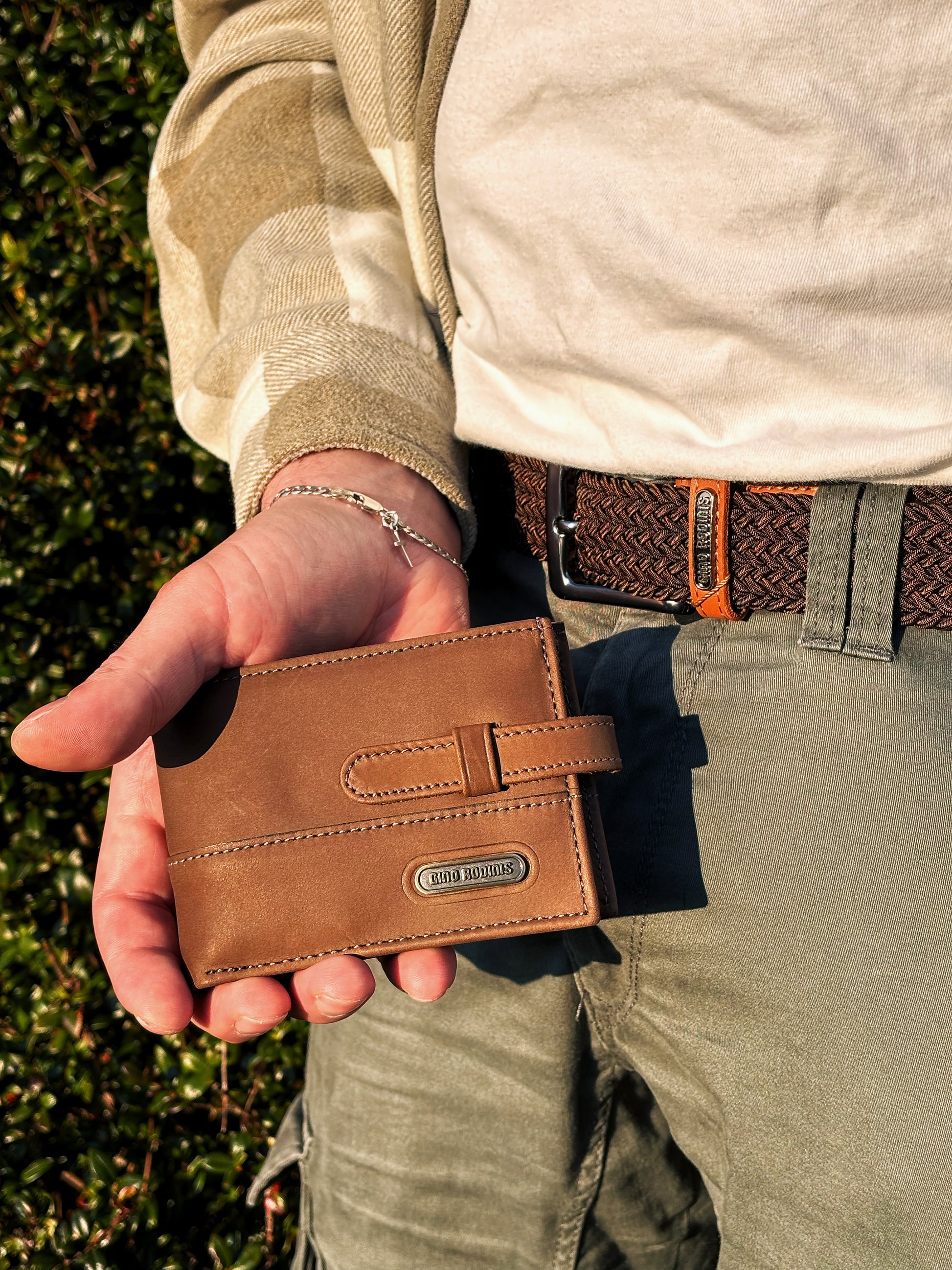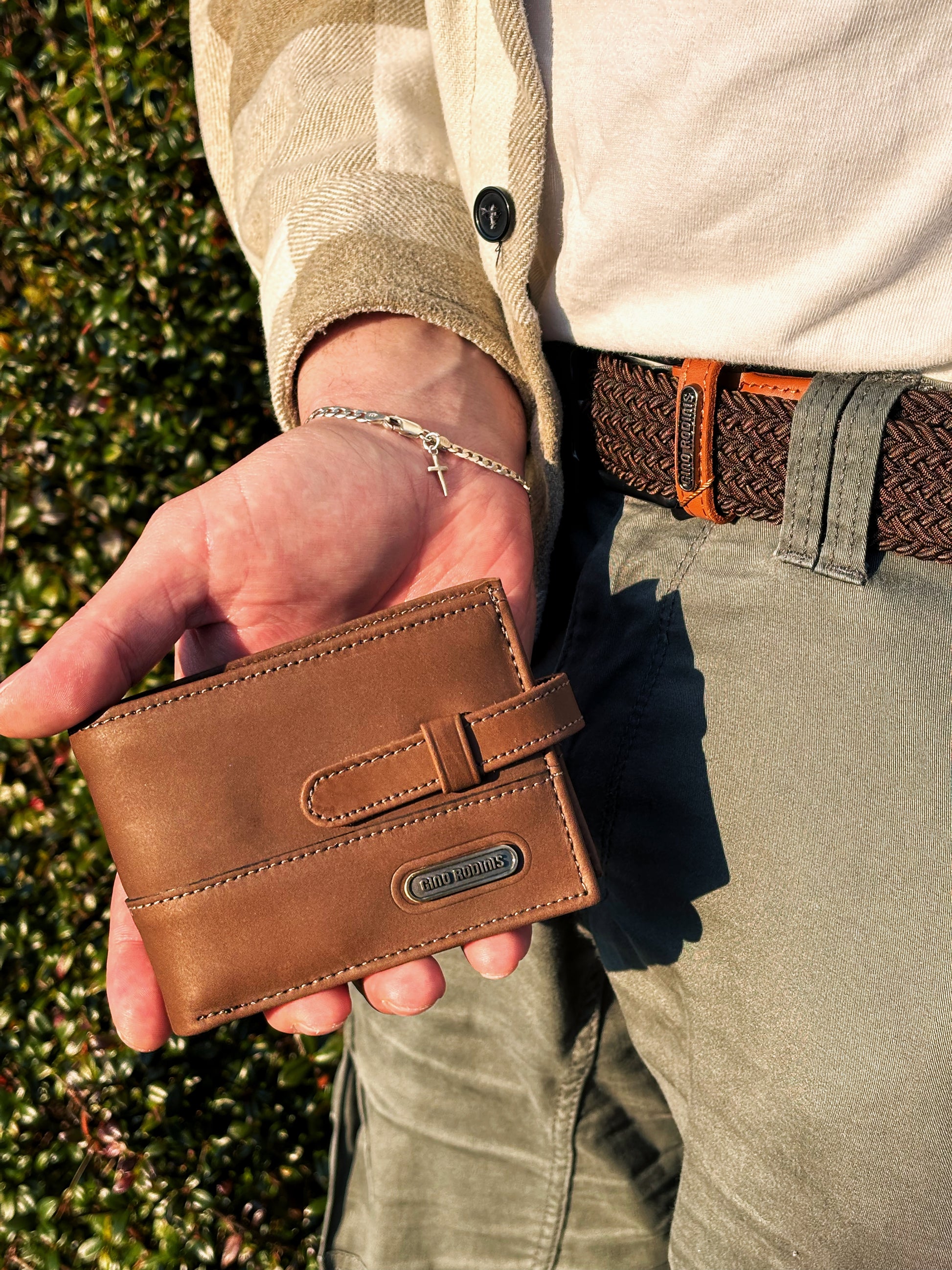 Confeccionada en cuero graso de alta calidad, esta billetera destaca por su resistencia y diseño práctico. Incorpora pasador exterior de seguridad para un cierre firme.