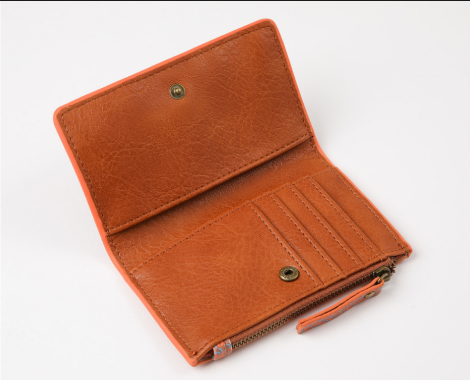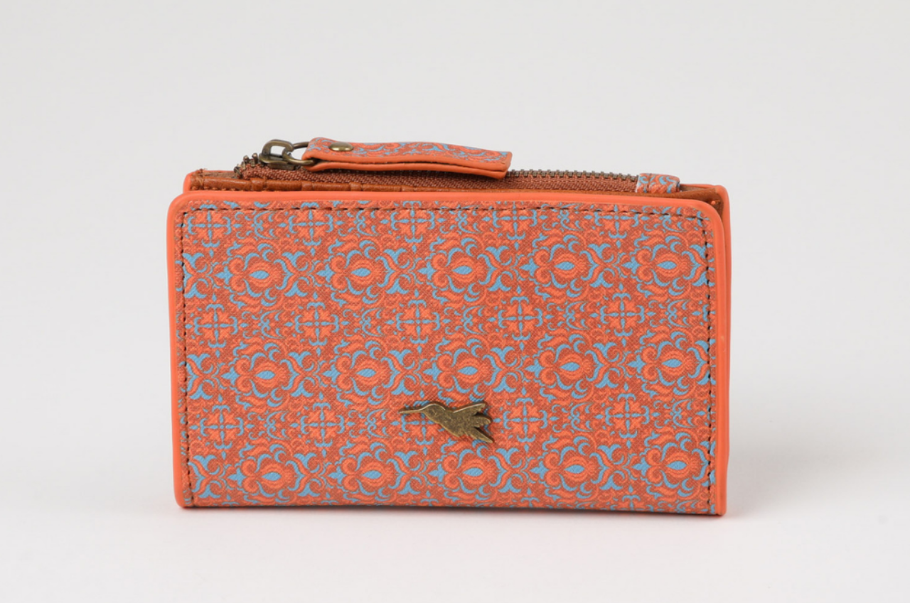 Billetera tarjetero de ecocuero café, con elegante estampado barroco en tonos naranjo y celeste. Incluye monedero y espacio para guardar hasta 6 tarjetas.