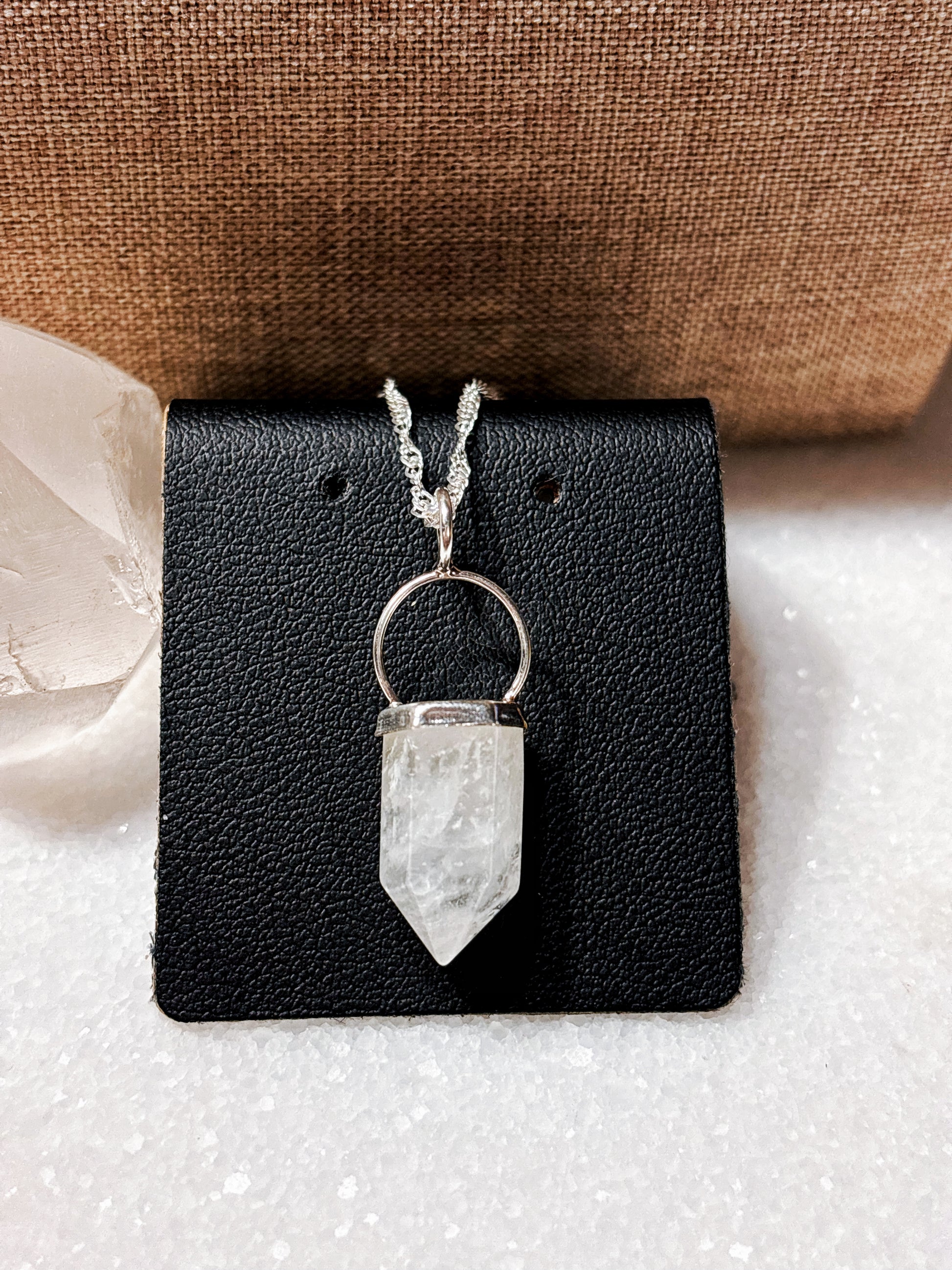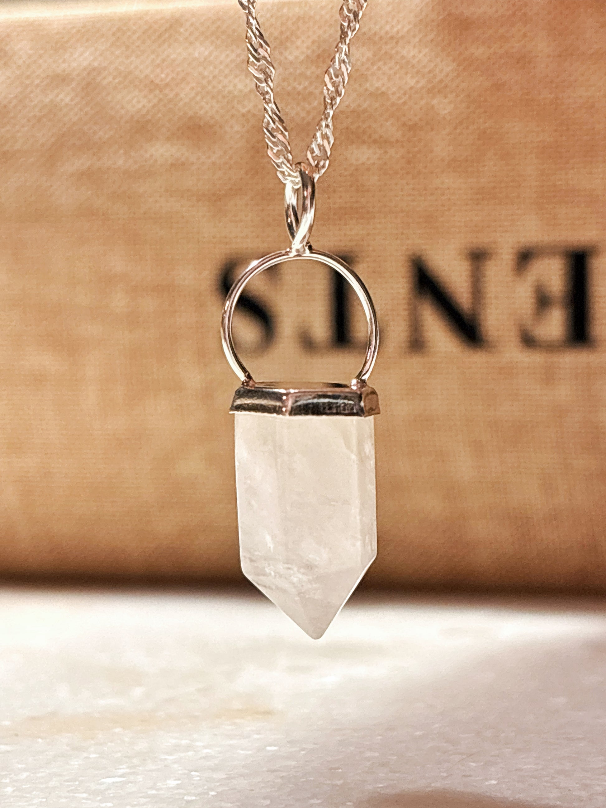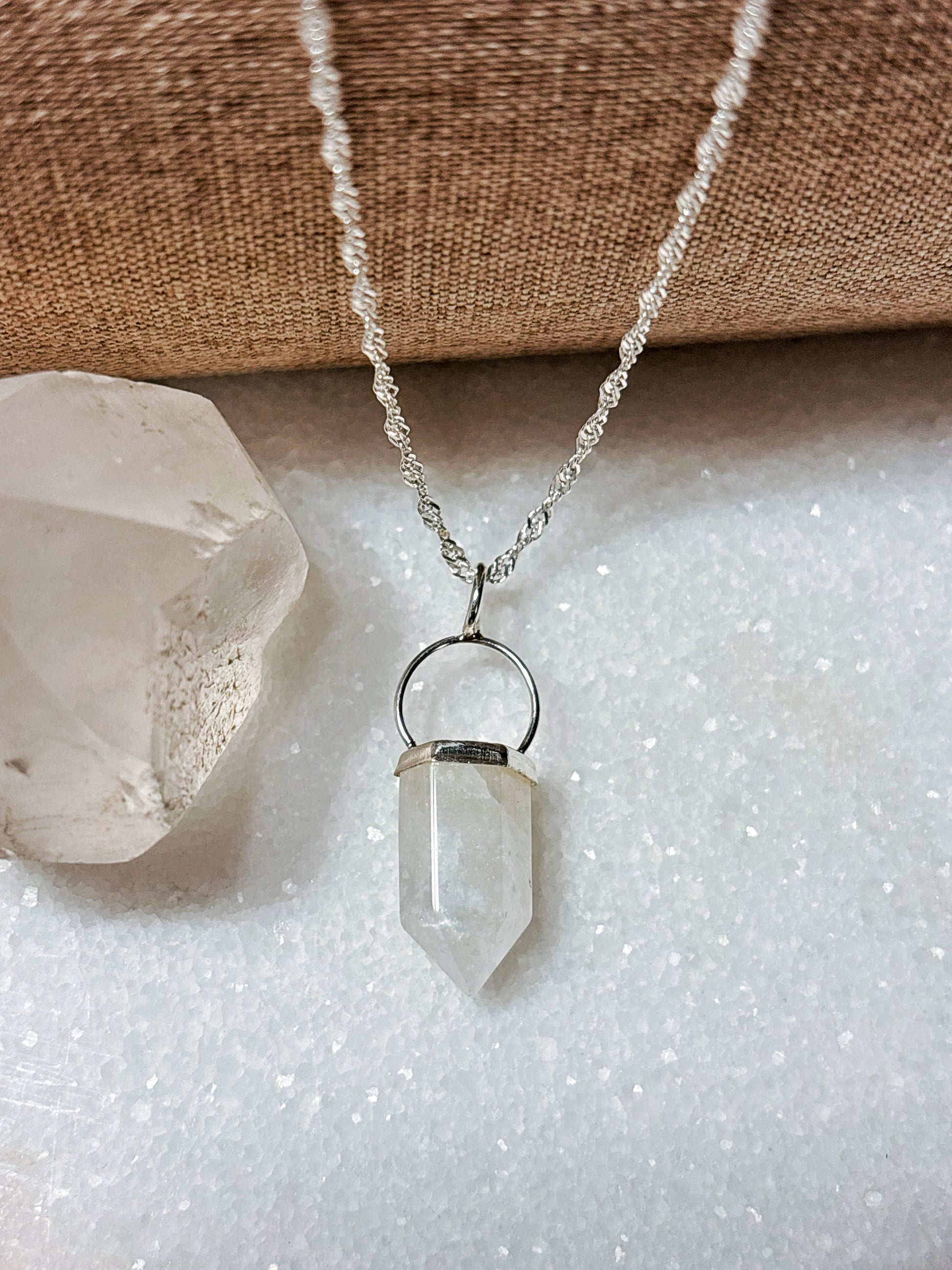Collar en plata ley 925 con cuarzo blanco, piedra asociada a la claridad, armonía y energía positiva. Un diseño delicado que combina elegancia y significado.
