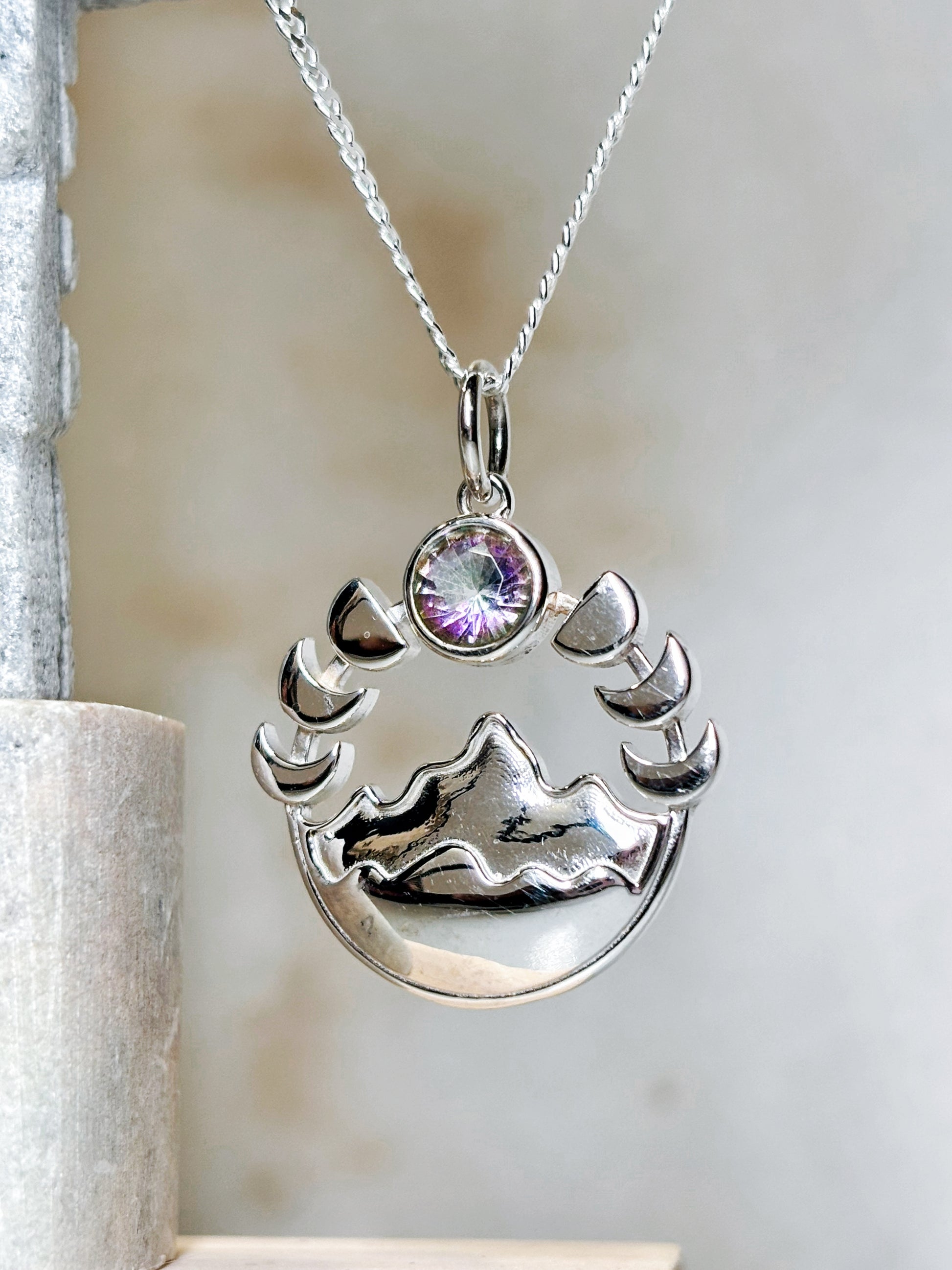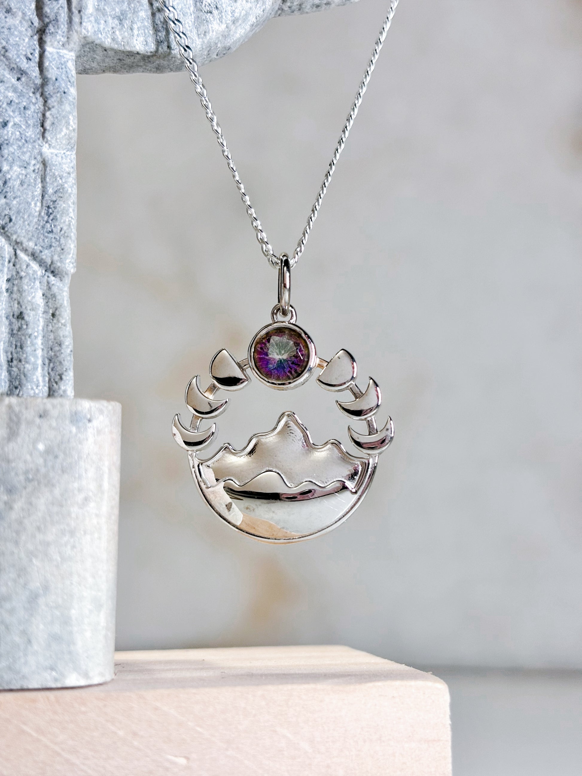 El poder de la montaña se une a la magia del cuarzo místico, una piedra que potencia la intuición y la protección energética. Este collar en plata 925 es un amuleto que invita a la calma, la claridad y la fortaleza espiritual.