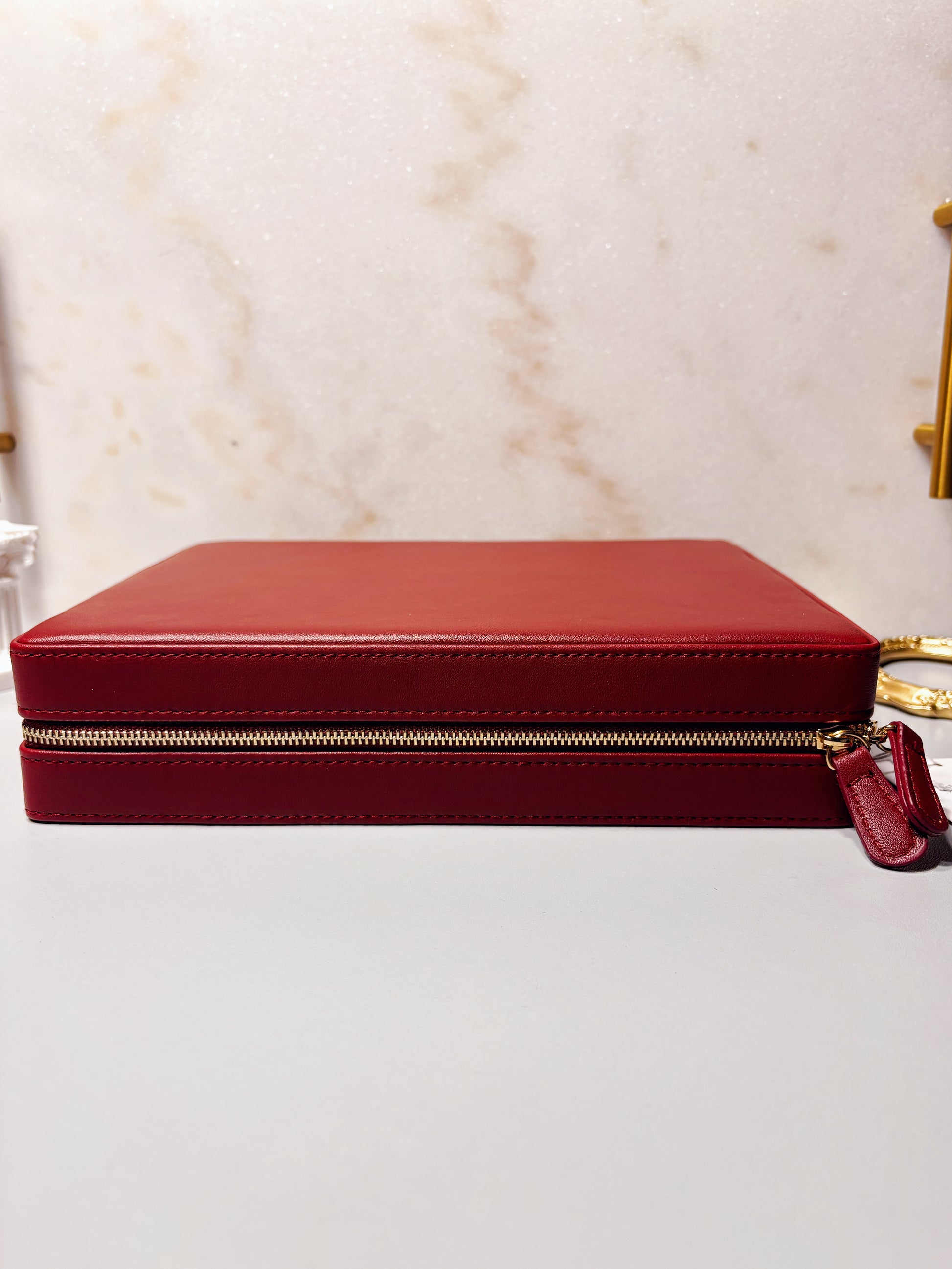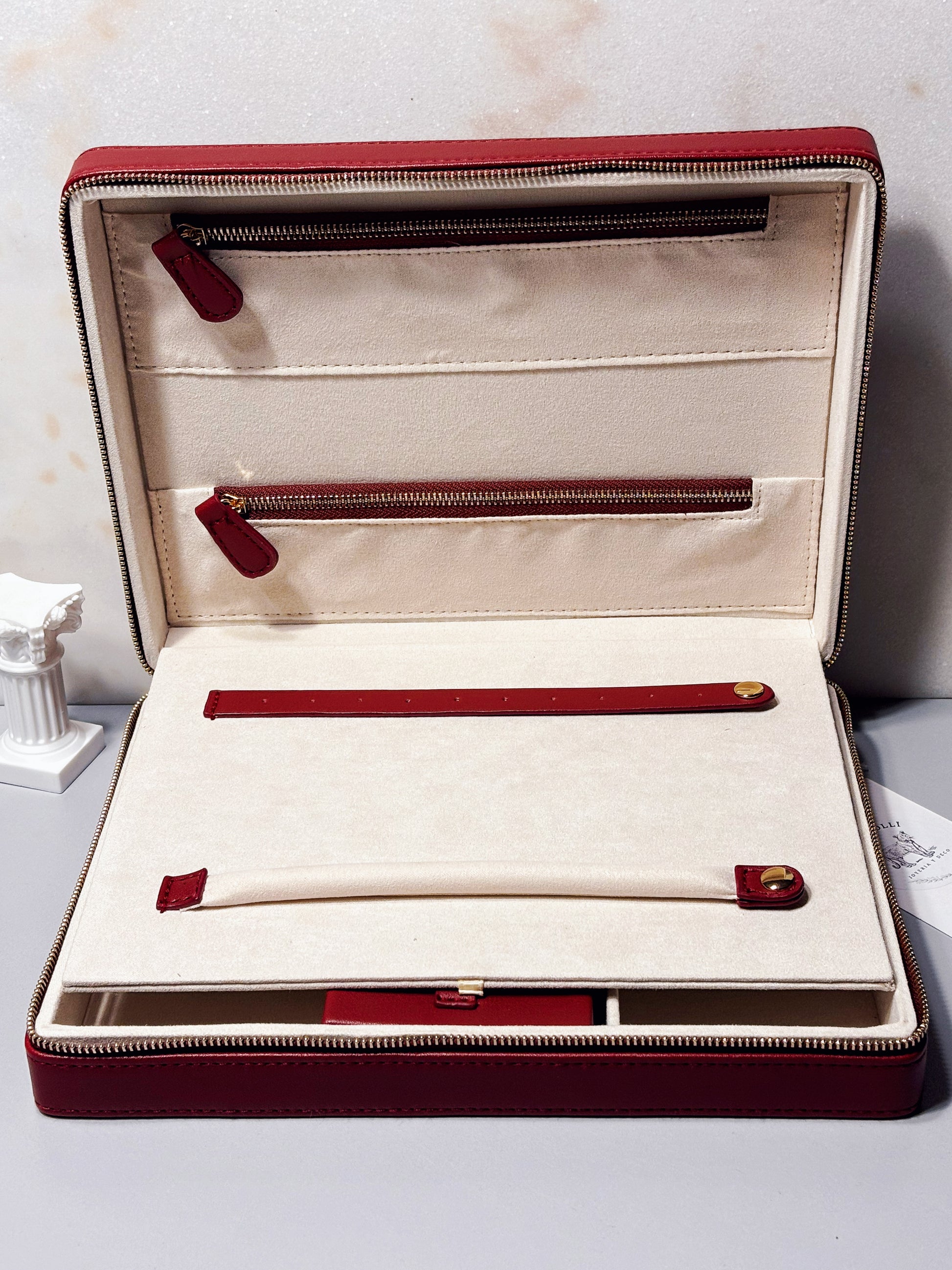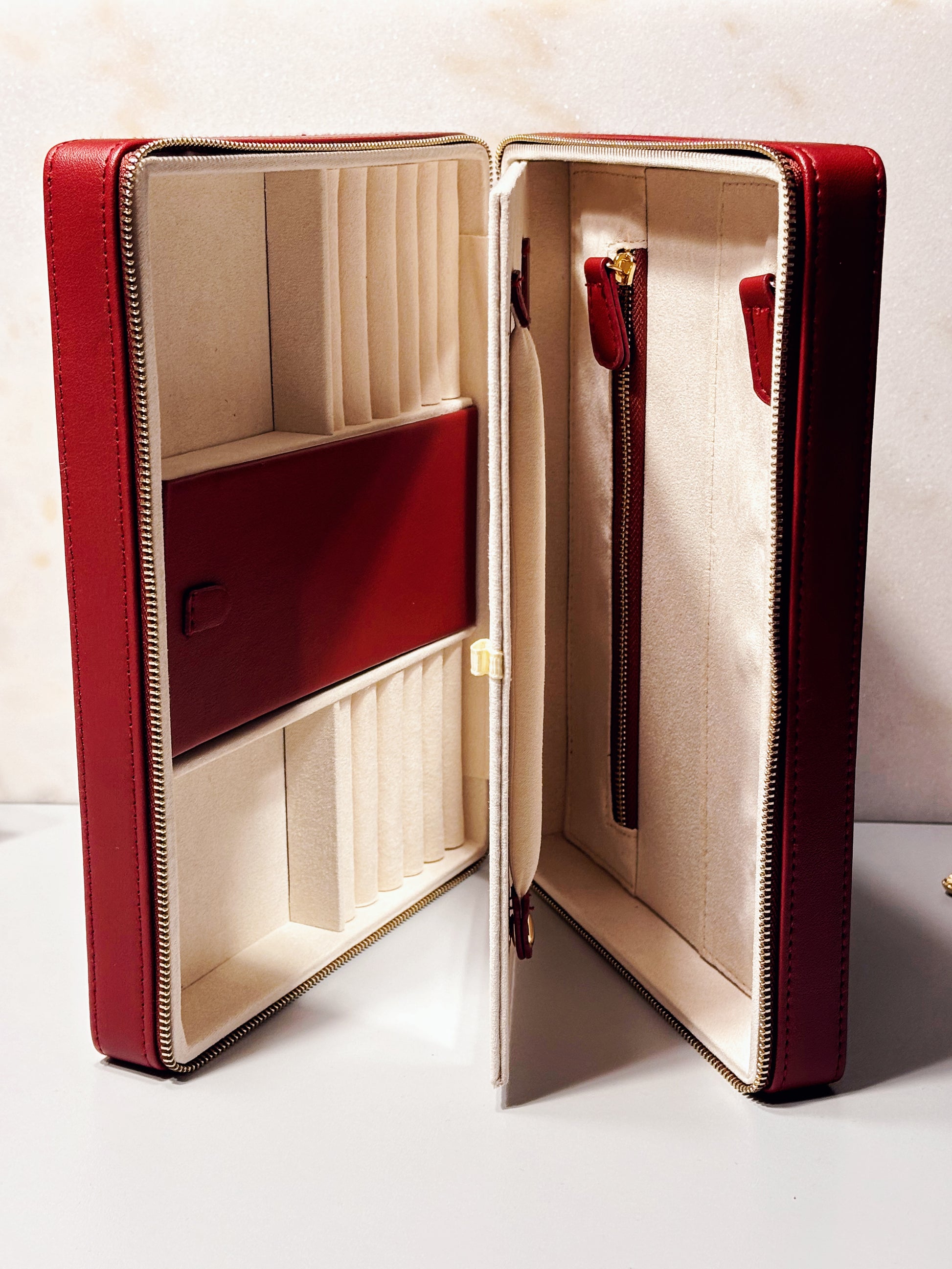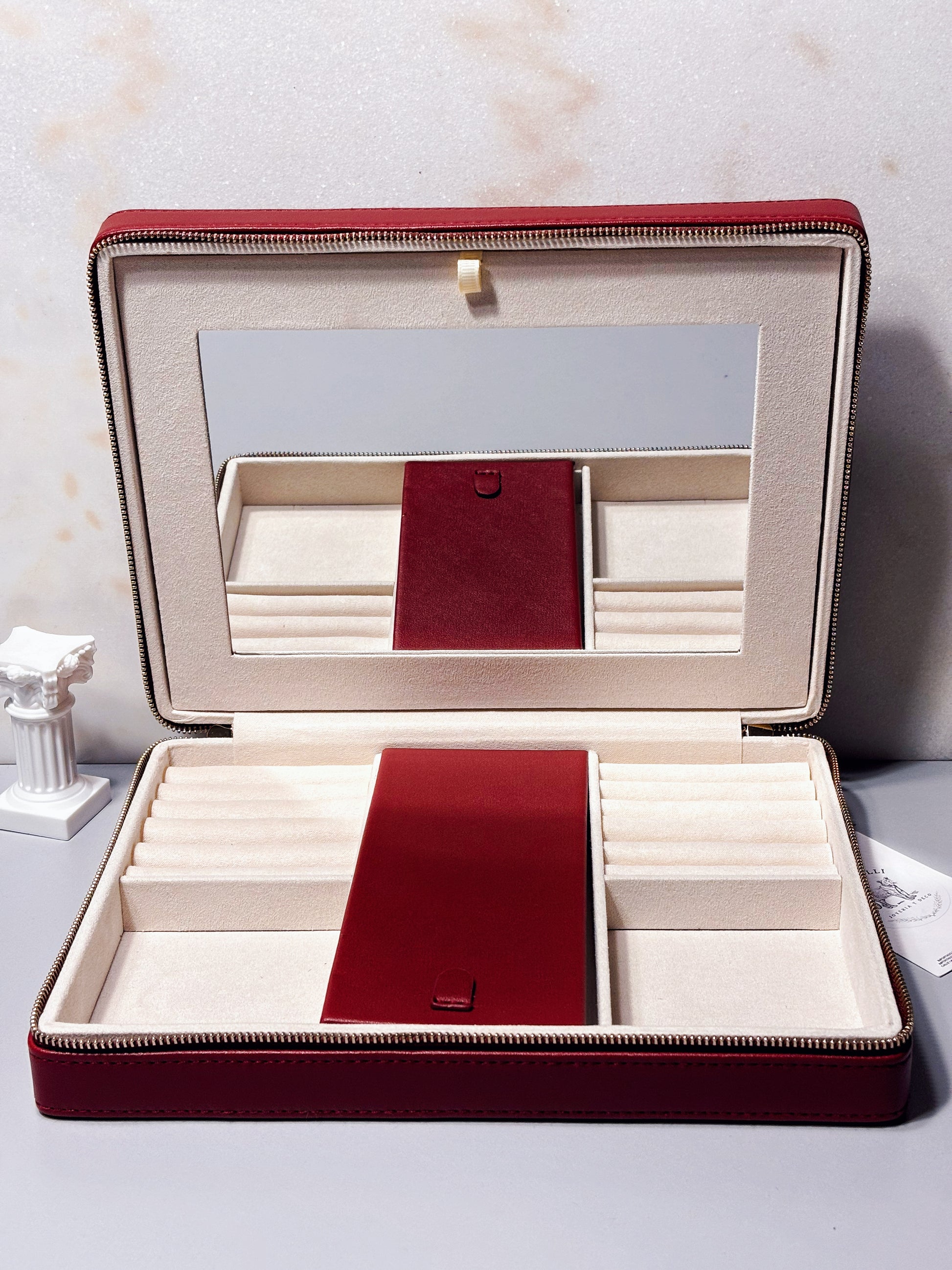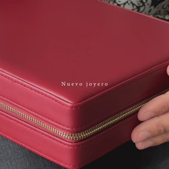 Este joyero de ecocuero rojo es mucho más que un simple accesorio: es un espacio pensado para guardar tus piezas más preciadas con estilo y cuidado. Su exterior en tono rojo profundo aporta un aire sofisticado y moderno, mientras que en su interior encontrarás compartimentos cuidadosamente distribuidos para anillos, collares, aros y pulseras. Además, incorpora un espejo que te permite probar tus joyas al instante.