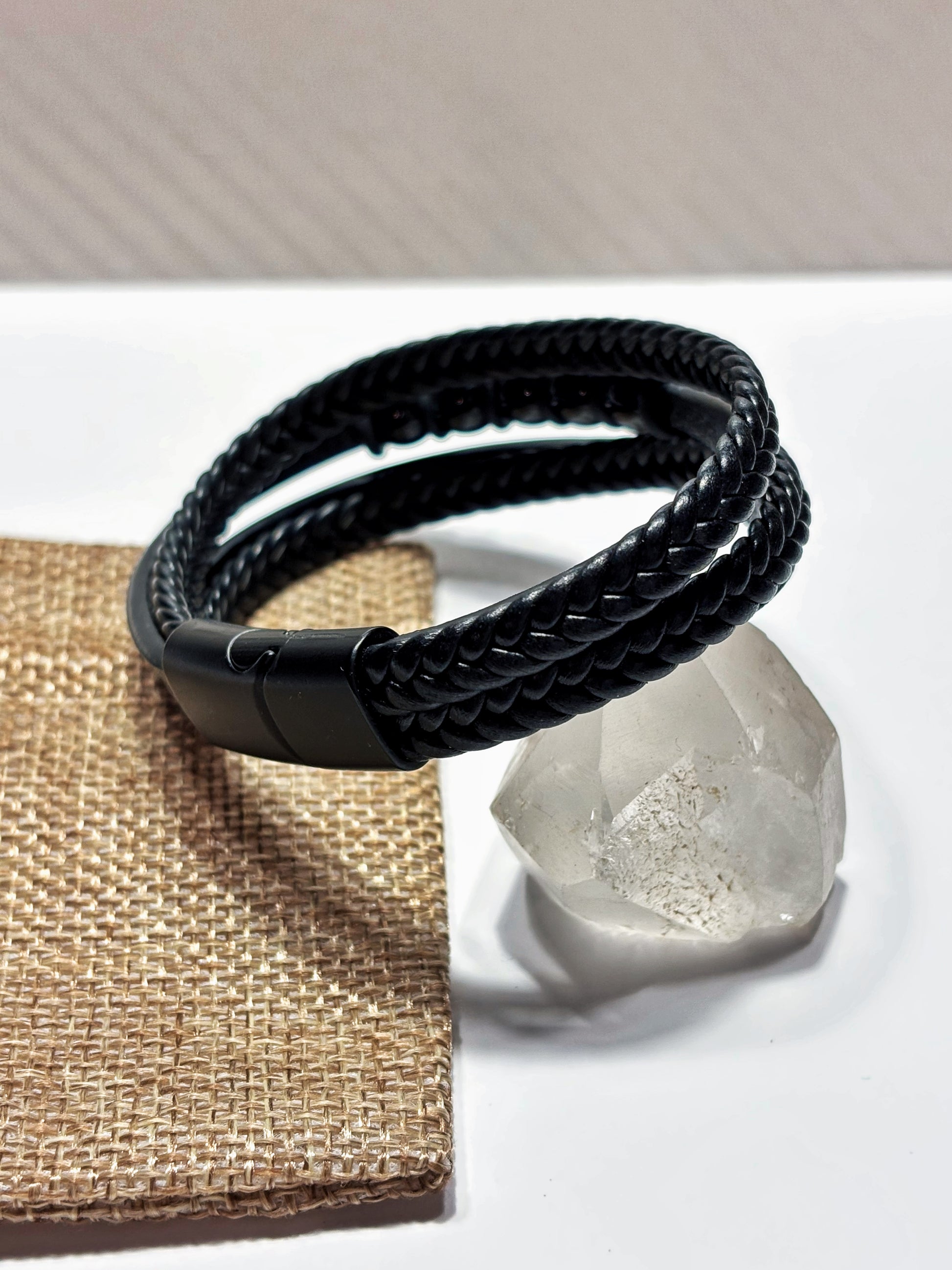Elegante y con carácter, esta pulsera combina ecocuero de alta calidad con piedra obsidiana, reconocida por su energía protectora y su capacidad de absorber lo negativo.