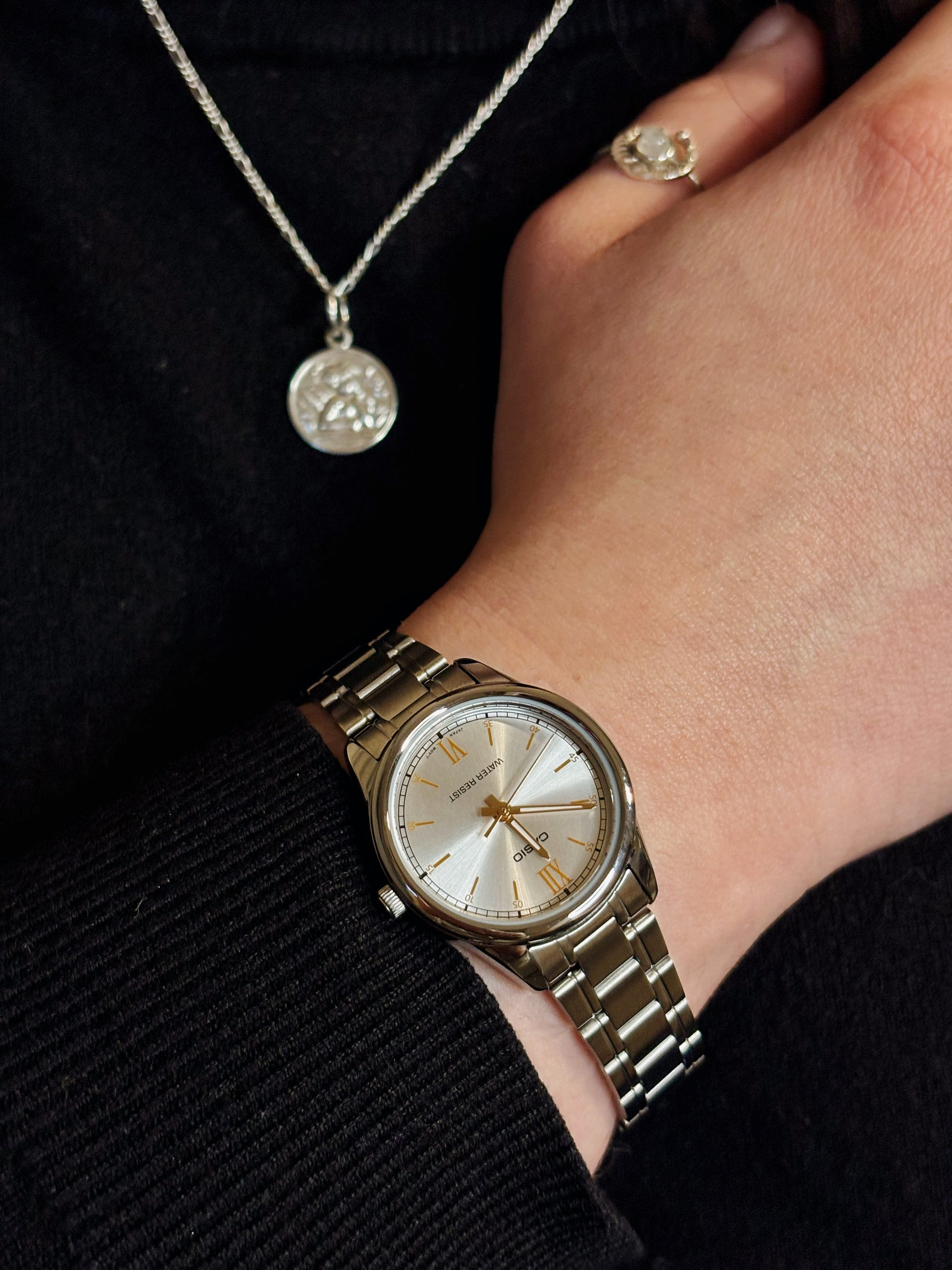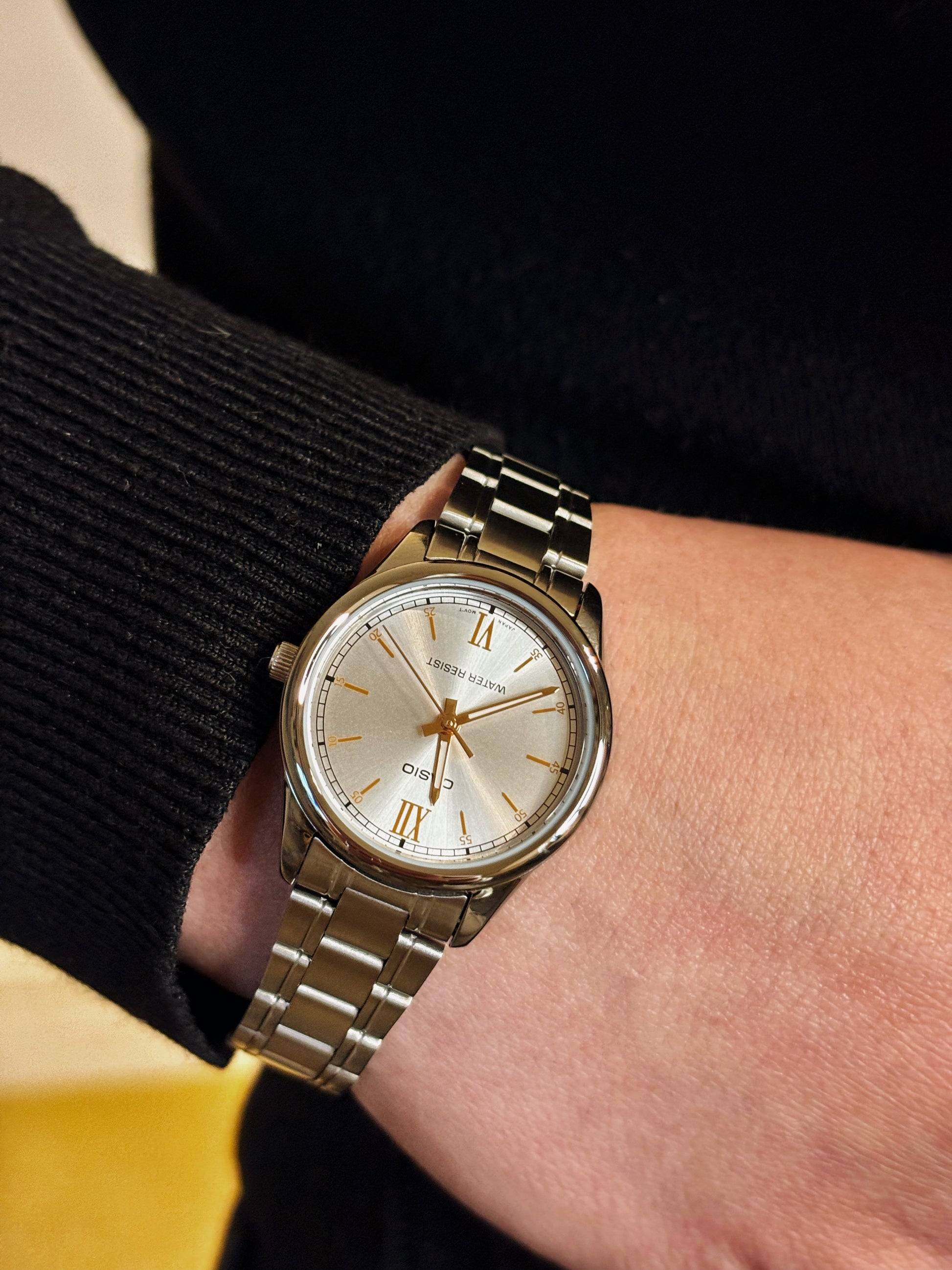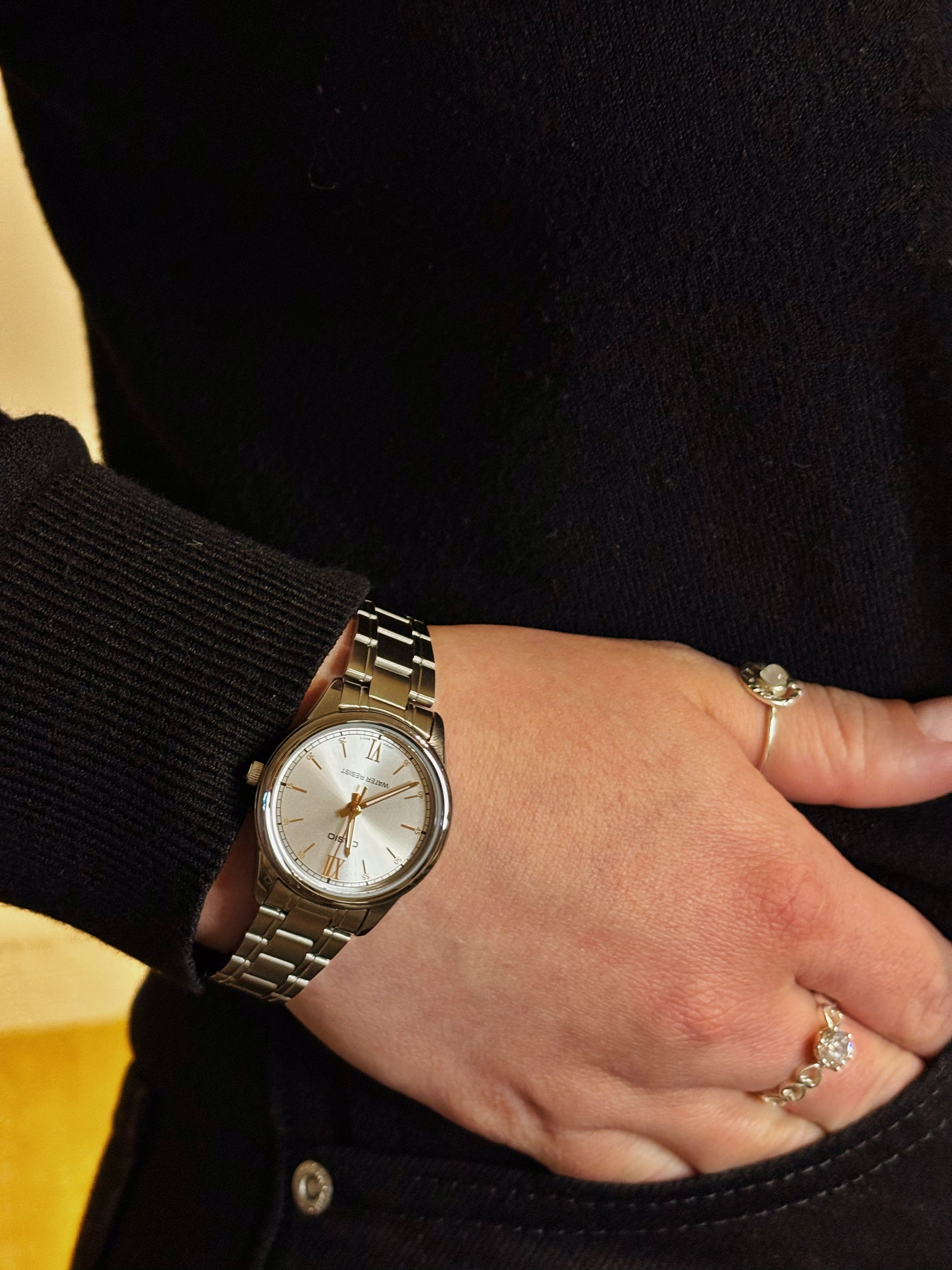 Diseño femenino y versátil con caja de resina cromada y brazalete de acero inoxidable. Su esfera blanca con números romanos dorados ofrece un estilo clásico, elegante y de lectura clara. Un reloj confiable, preciso y perfecto para looks formales o casuales.