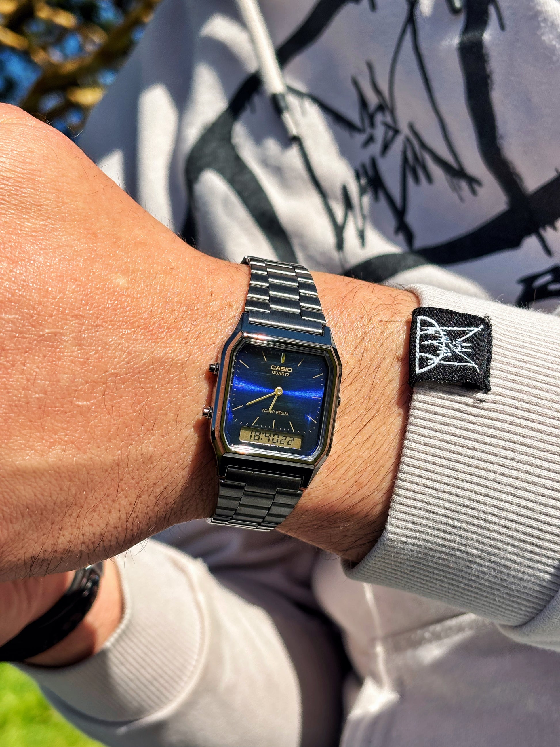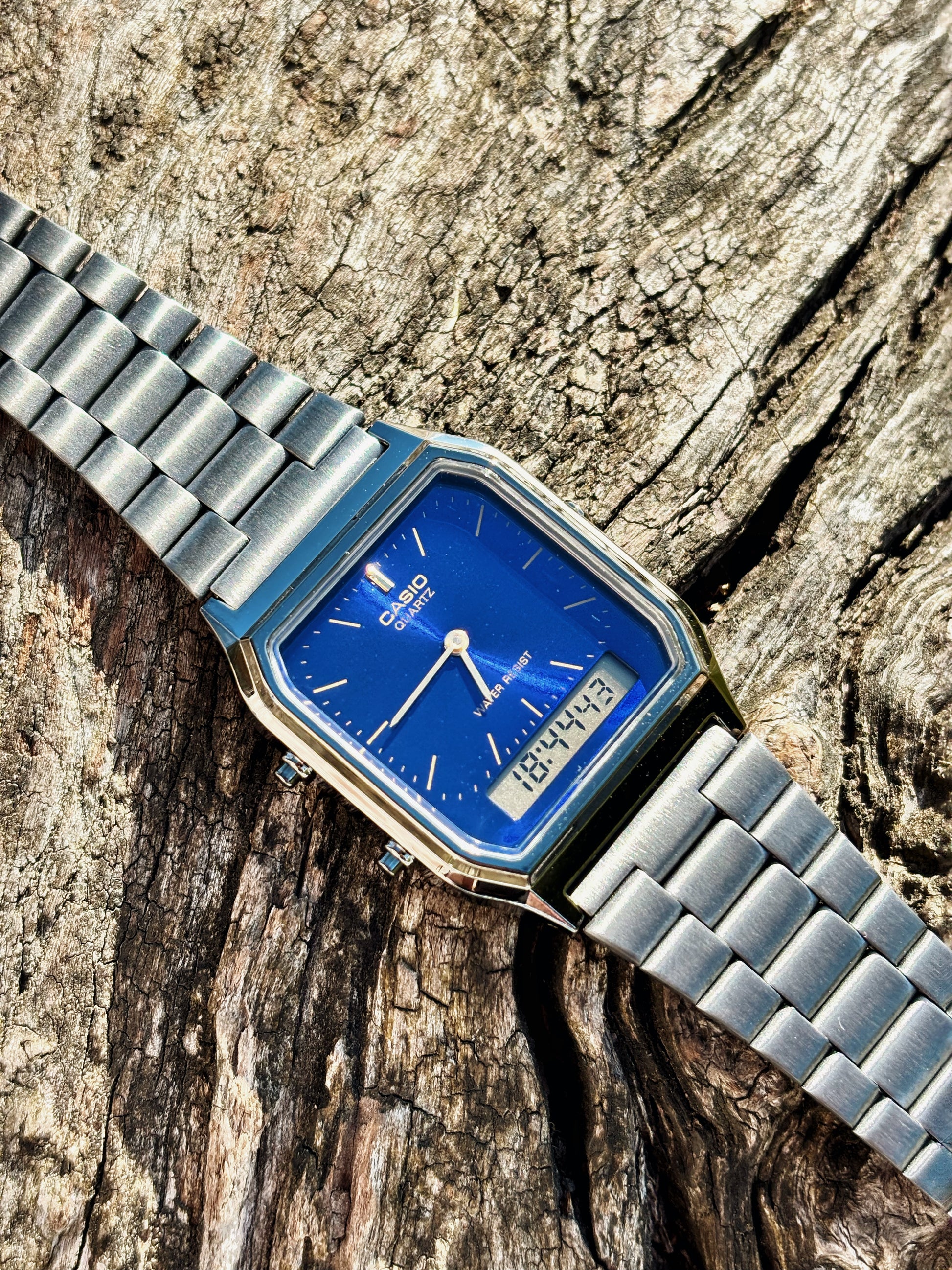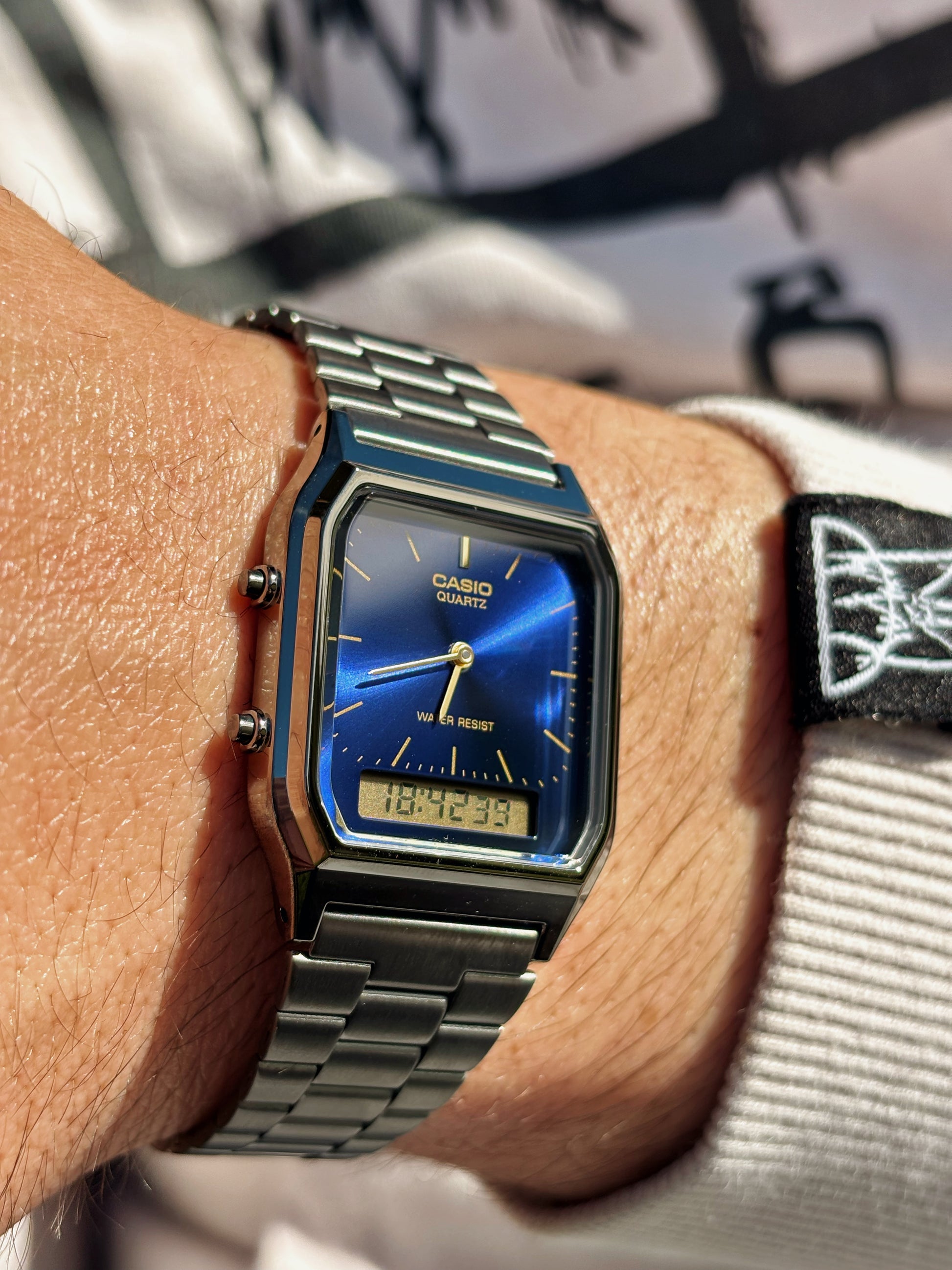 Diseño retro y elegante en acabado dorado, con esfera azul que aporta un contraste moderno. Combina análogo y digital, ofreciendo alarma, cronómetro y calendario. Su pulsera de acero garantiza comodidad y durabilidad. Con movimiento japonés y resistencia al agua, es una pieza versátil que une estilo vintage y funcionalidad actual.