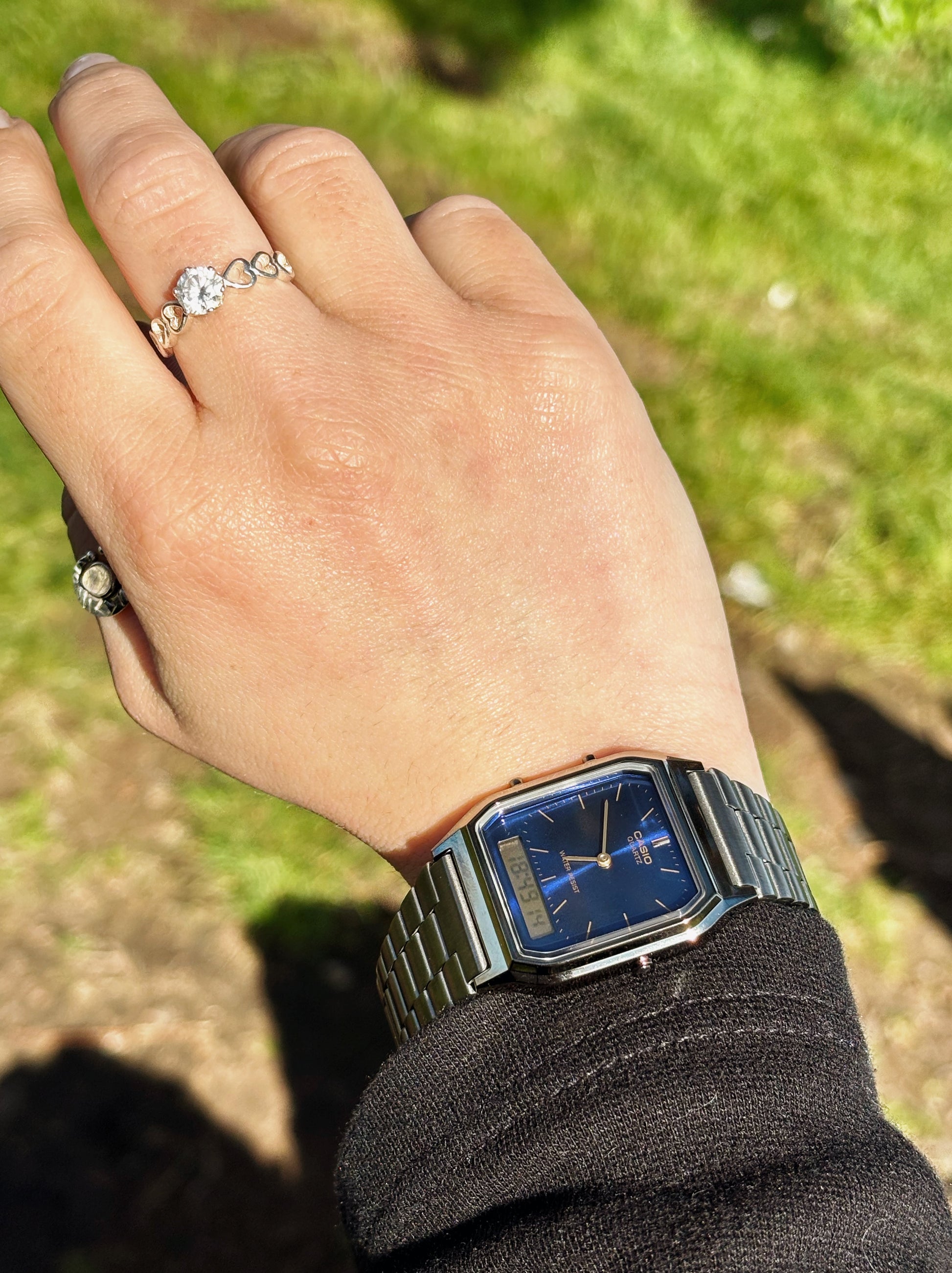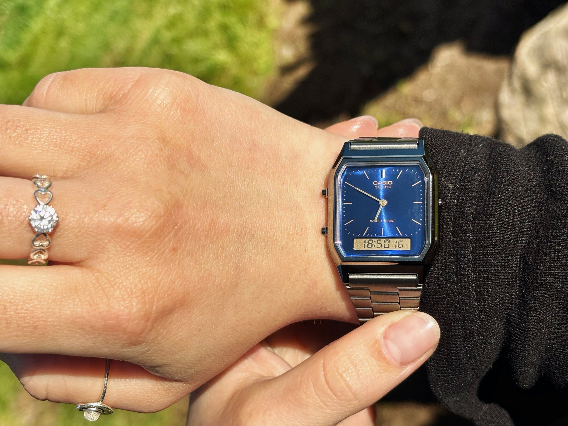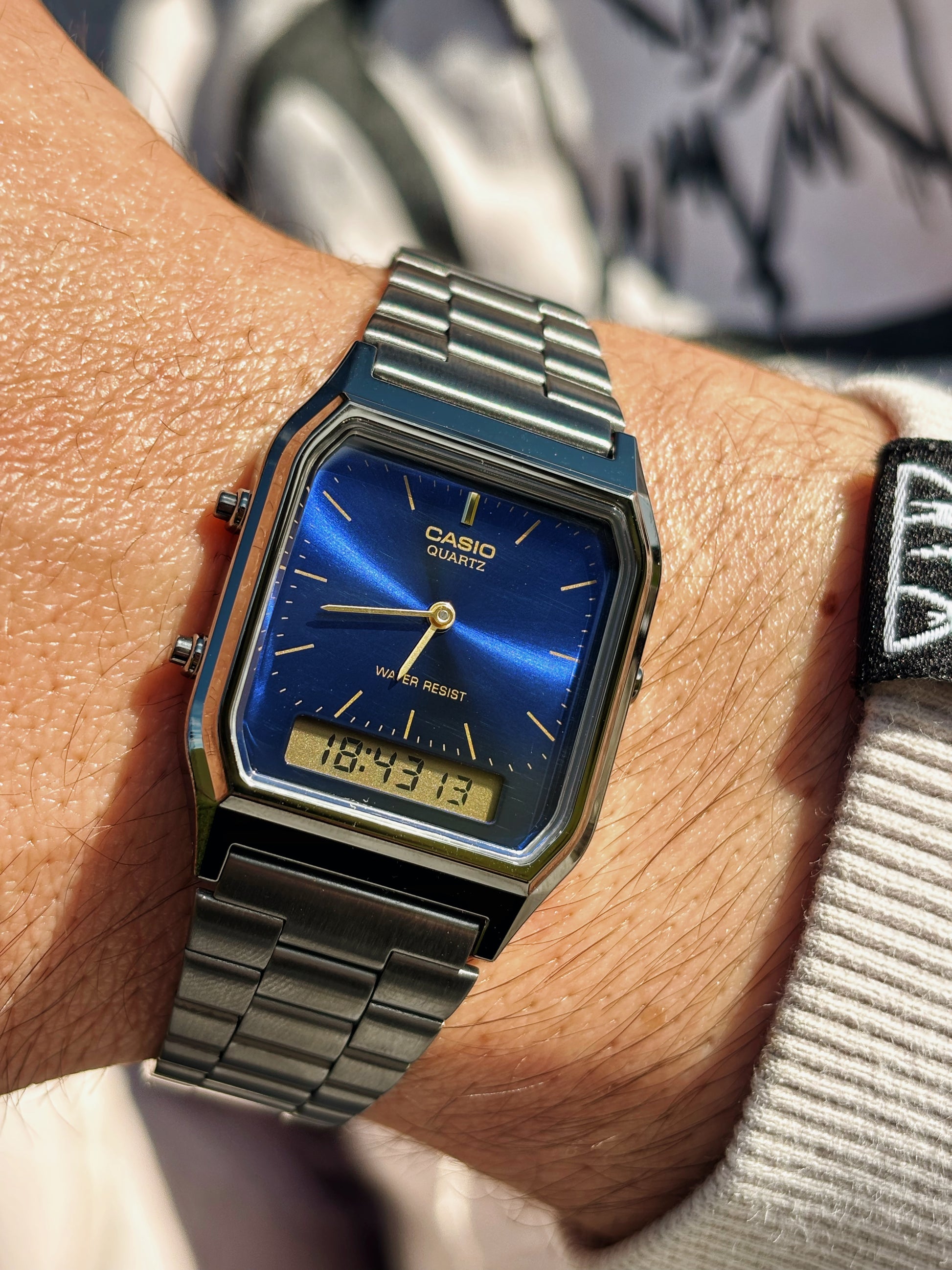 Diseño retro y elegante en acabado dorado, con esfera azul que aporta un contraste moderno. Combina análogo y digital, ofreciendo alarma, cronómetro y calendario. Su pulsera de acero garantiza comodidad y durabilidad. Con movimiento japonés y resistencia al agua, es una pieza versátil que une estilo vintage y funcionalidad actual.