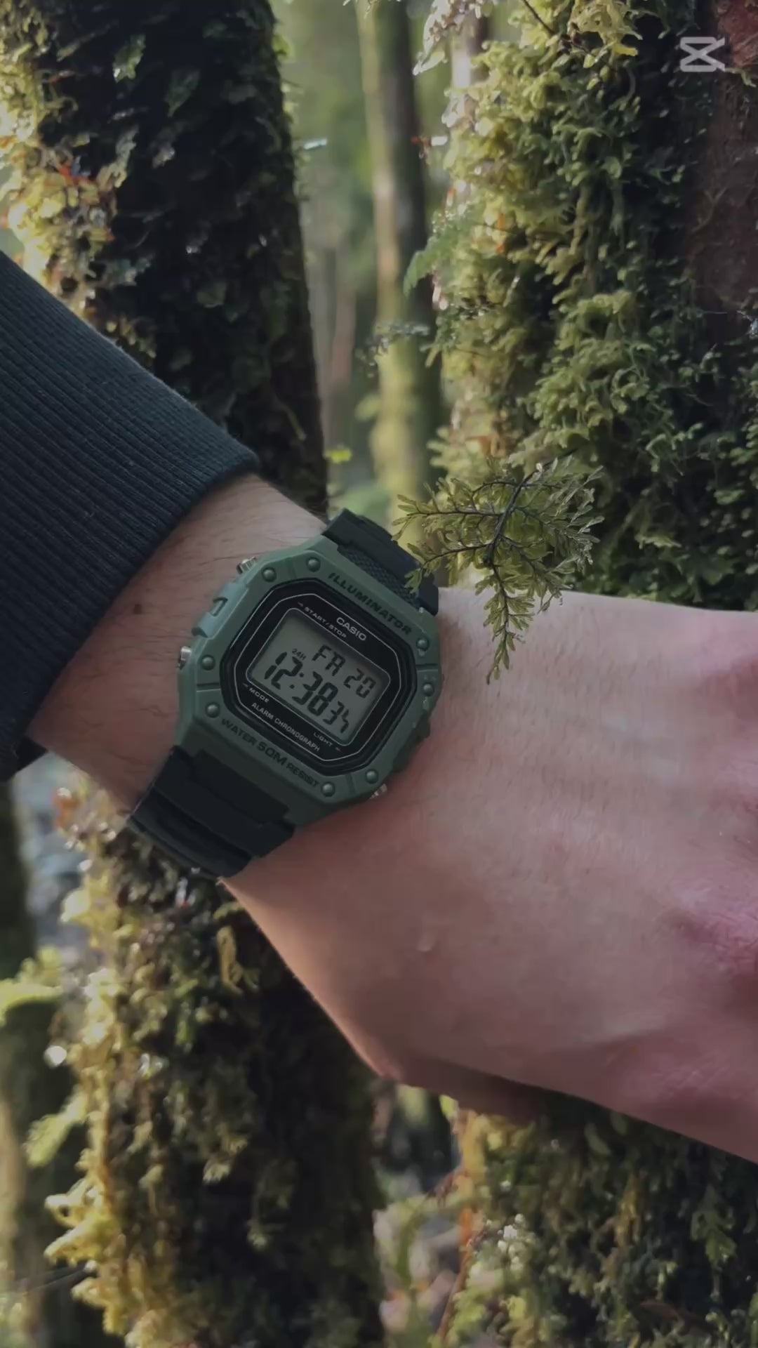 Diseño robusto con correa en verde militar con pantalla digital clara y retroiluminada, resistente al agua, cronómetro y alarma incorporados.